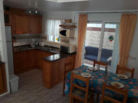 Amerikanische Küche mit Ess-Ecke und Blick zum Wintergarten